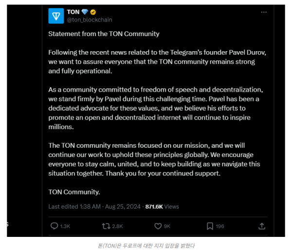텔레그램이 통합한 블록체인 프로토콜인 톤(The Open Network, TON)은 두로프 체포 이후에도 정상적으로 운영 중이다.