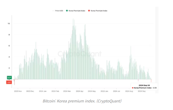 25일(현지 시간) 코인데스크에 따르면 암호화폐 분석업체 크립토퀀트의 비트코인 한국 프리미엄 지수는 이날 -0.55로, 마이너스 영역으로 떨어지면서 2023년 10월 이후 가장 큰 할인 폭을 기록했다. 한국 프리미엄 지수는 한국과 해외 거래소의 가격 차이를 추적한다. 이 지수의 마이너스 전환은 한국 시장에서 비트코인의 인기가 상대적으로 하락했음을 의미한다.