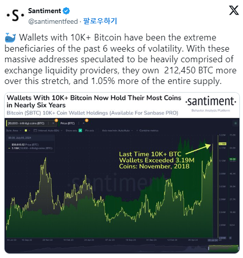 온체인 분석업체 산티먼트(Santiment)의 데이터에 따르면, 이러한 대규모 지갑들은 319만 개 이상의 코인을 보유하고 있다. 이는 2018년 11월 이후 처음으로 달성된 이정표다.