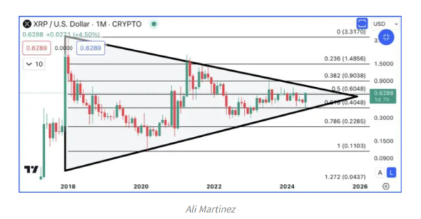 한편 유명 분석가 알리 마르티네즈는 전일 엑스 게시물에서 XRP가 지난 6년간 대칭형 삼각형 내에서 다지기를 해왔으며 0.90 달러를 넘어설 경우 삼각형 패턴으로부터의 강세 브레이크아웃이 가능할 수 있다고 밝혔다. 0.90 달러는 피보나치 0.382 되돌림 레벨로 중요한 저항선으로 간주된다.