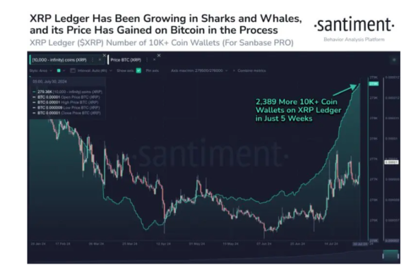 암호화폐 시장 정보 플랫폼 산티멘트가 31일(현지 시간) 엑스(X)에 올린 게시물에 따르면 최소 1만 XRP 이상 보유 지갑 숫자가 지난 5주일 동안 2389개 증가, 총 27만9400개로 늘어났다. 이는 6개월 최고 수준이다.
