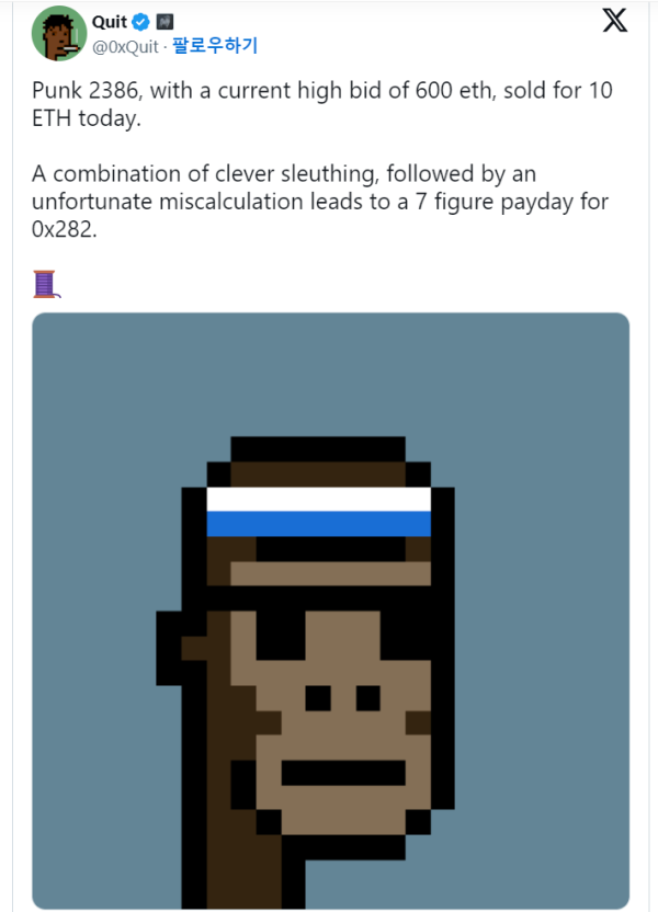 현재 Punk #2386의 새 소유자의 신원은 공개되지 않았으며, NFT는 아직 판매 목록에 오르지 않았다. 그러나 이미 한 명의 구매자가 600 ETH를 제안한 상태이기 때문에 이 금액에 판매된다면, 새 소유자는 60배의 수익을 얻게 된다.