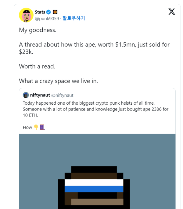 크립토 펑크(CryptoPunks)는 NFT 시장에서 가장 가치 있는 자산 중 하나로, 이더리움 블록체인 기반의 1만 개의 프로필 사진 컬렉션 중 하나다. 특히, Punk #2386은 전체 1만 개 중 단 24개만 존재하는 ‘에이프(ape)’ 유형으로 NFT 커뮤니티에서 인기가 높다.  최근에도 이와 유사한  ‘에이프’ 이미지는 약 150만 달러에 거래된 바 있어 이번 거래는 더욱 주목 받았다.