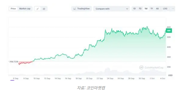 4일(현지시간) 크립토폴리탄에 따르면, TAO는 9월 초 230달러대에서 시작해 현재 569.44달러에 거래되며, 지난달에만 100% 이상의 상승률을 기록했다. 이는 2024년 들어 가장 성공적인 상승세로, 1월의 78% 상승률을 훨씬 넘어섰다.