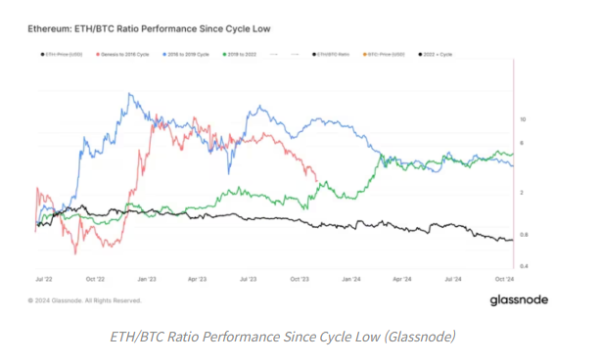 글래스노드 차트는 ETH/BTC 비율이 2022년 6월의 사이클 저점 이후 계속해서 더 낮은 저점을 만들어왔음을 보여준다. 이전 사이클인 2016-2019년과 2019-2022년에는 ETH/BTC 비율이 사이클 저점에서 최소 200%의 상승이 있었지만, 이번 사이클에서는 2022년 6월 저점 대비 25%나 낮아졌다. 이는 이더리움이 비트코인 대비 부진했음을 나타낸다.