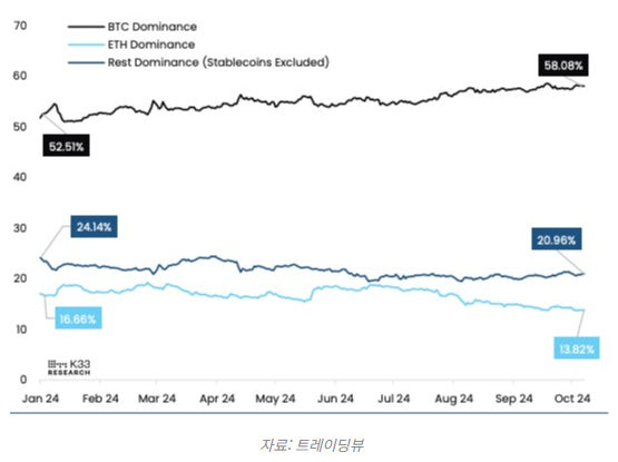 한편, 비트코인은 7만4000달러에 달했던 최고점에서 하락한 6만2000달러 대에 거래되고 있지만, 올해 들어 40% 상승하며 시장 지배력이 52.5%에서 58%로 증가했다.