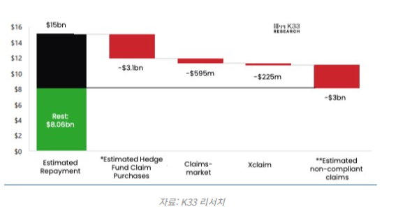K33에 따르면, 상환된 자금 중 약 24억 달러가 암호화폐 시장에 다시 유입될 것으로 보인다. 이는 전체 청구액 중 일부에 해당하며, 많은 부분이 크레딧 펀드나 제재 대상 국가, 고객 덩조 확인(KYC) 미인증자들에 속해 다시 시장에 유입되지 않을 것으로 분석됐다.