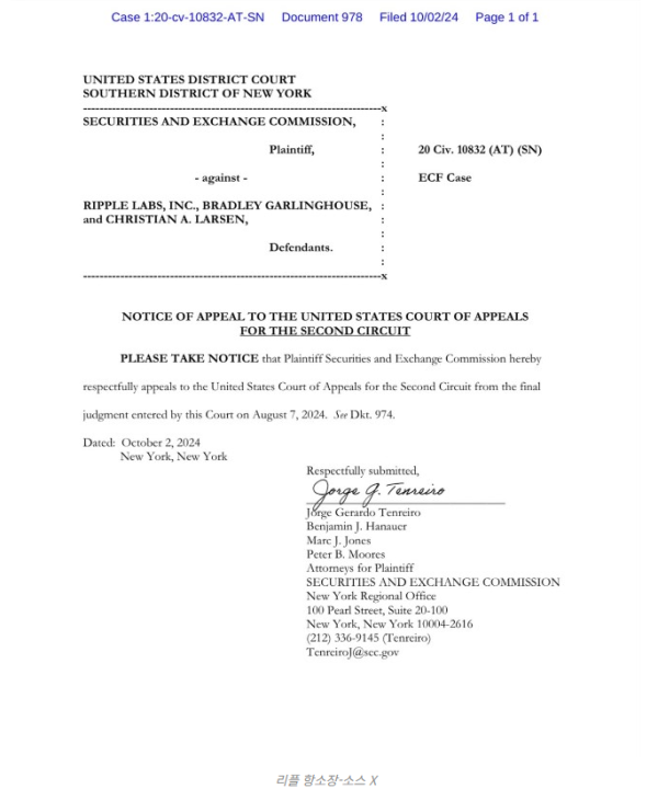 이어서 지난 8월, 토레스 판사는 리플사에 1억 2,500만 달러의 벌금을 부과했으나, SEC가 요청한 20억 달러에 비해 훨씬 낮은 금액이었다. 결국 SEC는 토레스 판사의 판결에 불복, 항소를 결정했다.