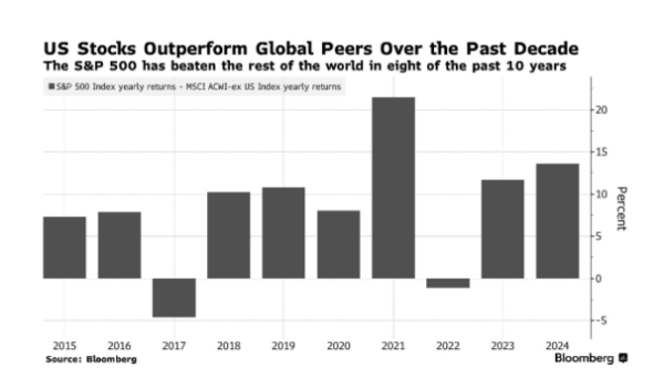 미국 주식은 글로벌 금융위기 이후 제로에 가까운 저금리, 그리고 이어 탄력성 있는 경제 성장에 대한 베팅에 힘입어 랠리를 이어왔다. 블룸버그 데이터에 의하면 S&P 500 지수는 지난 10년 중 8년 동안 세계 다른 지역 시장을 능가하는 성과를 나타냈다.