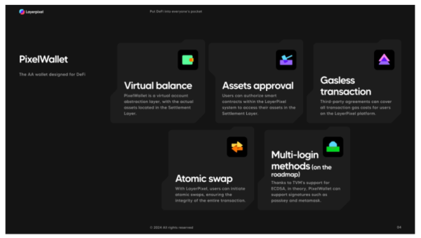 또한, 레이어 픽셀의 계층형 아키텍처는 개발자들에게 유연성과 확장성을 제공해 다양한 사용자와 개발자의 요구를 충족시킨다. 아울러 픽셀월렛은 사용자와 개발자가 가스 비용을 걱정하지 않고 거래할 수 있도록 지원하며, 아토믹 스왑(Atomic Swap) 기능을 통해 여러 거래를 한 번에 완료할 수 있다.