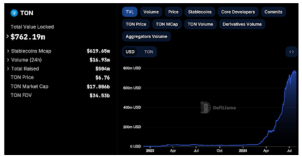 TON 생태계의 총 잠금 가치(TVL)는 지난달 말 7억4000만 달러로 5개월 만에 32배 증가했다. TON 생태계 이 밖에 TON 게임파이  프로젝트인 ‘낫코인(Notcoin, $NOT)’과 ‘블랙 앤 화이트 도그(Black and White Dog, $Dogs)’ 등 밈코인에 대한 열기도 뜨겁다.