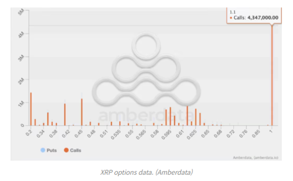 앰버데이터에 따르면 기사 작성 시점 기준 데리빗 거래소에서 8월 28일 만기인 XRP의 1.10 달러 콜옵션 미결제약정은 434만7000 계약(244만 달러)으로 밝혀졌다. 이는 데리빗 거래소에서 제공되는 모든 XRP 옵션 상품의 미결제약정 가운데 단연 최고치다.