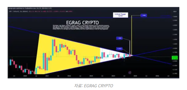 그럼에도 불구하고 일부 분석가들은 XRP의 장기적인 상승 가능성에 대해 낙관적이다. 유명 암호화폐 트레이더 이래그 크립토(EGRAG CRYPTO)는 XRP가 2024년 말까지 7.50달러에 이를 수 있다고 전망했다. 그러나 이 시나리오가 실현되려면 향후 이틀 안에 XRP가 0.5930달러 저항선을 돌파해야 한다고 덧붙였다.