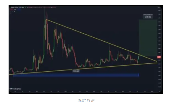 XRP는 사상 최고가 이후 큰 대칭 삼각형 패턴을 형성해왔으며, 현재 가격은 삼각형의 하단에 위치해 있다. XRP는 2018년 1월 사상 최고가인 3.84달러를 기록했지만 이후 지속적인 하락세를 면치 못하고 있다.