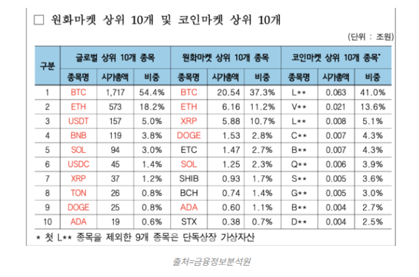 이번 금융위 조사에 따르면 국내 원화 거래소와 해외 가상자산 시장의 시가총액 구성도 다소 차이를 보였다. 비트코인(BTC)은 세계 시장에서 가장 큰 비중을 차지하며 전체 시가총액의 약 54.4%를 기록했다. 이어 이더리움(ETH)이 18.2%를 차지해, 두 자산의 시가총액이 전체의 70%를 넘어섰다.