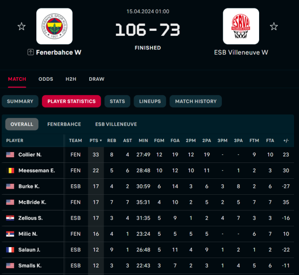 페네르바체(여성)팀의 많은 경기 1쿼터 득점은 개오버임.