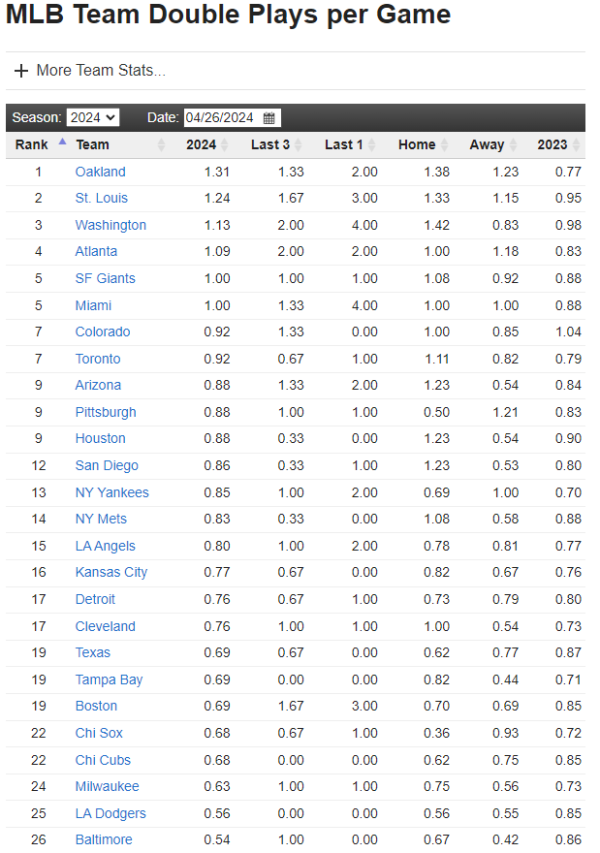 MLB 더블 플레이 많이 당하는 팀 순서입니다