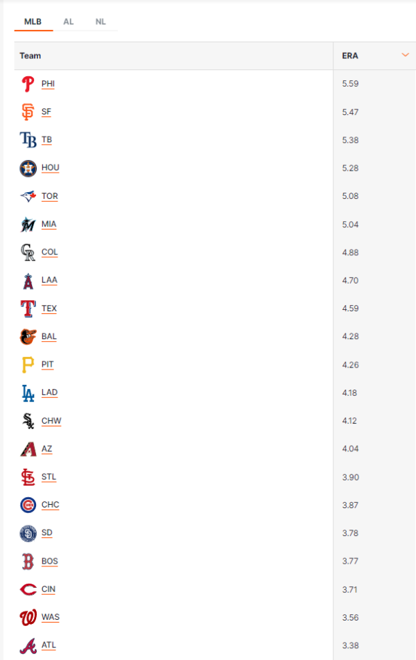 불펜 방어율이 가장 안 좋은 팀은 필라델피아이고