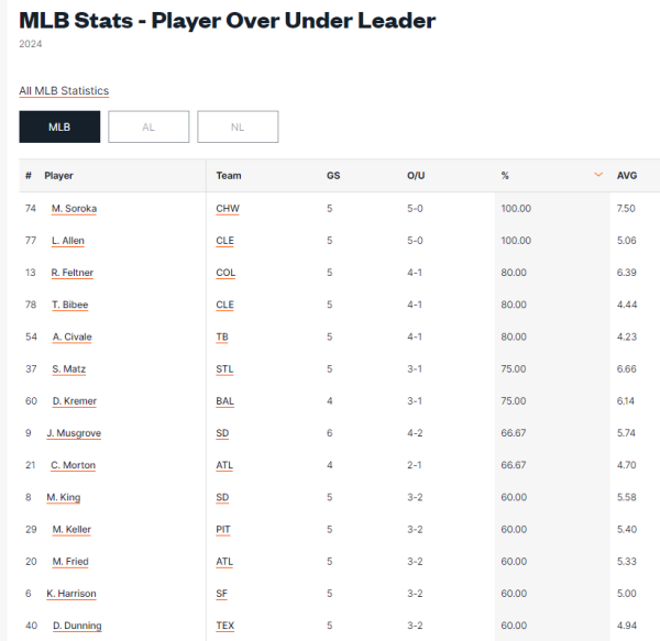 MLB 2024 시즌 선발 투수들 중 오버를 많이 내는 투수 순입니다