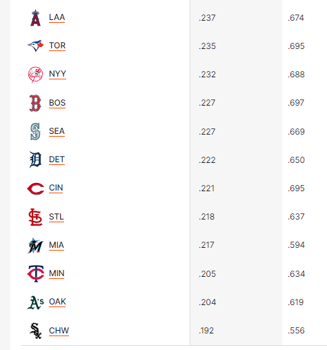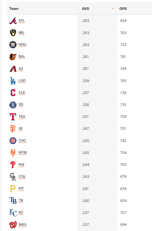 팀타율 및 OPS가 가장 좋은 팀은 애틀란타이며