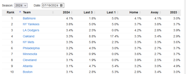 이 통계는 팀의 전체 타석 중에서 홈런이 차지하는 비율을 나타냅니다.