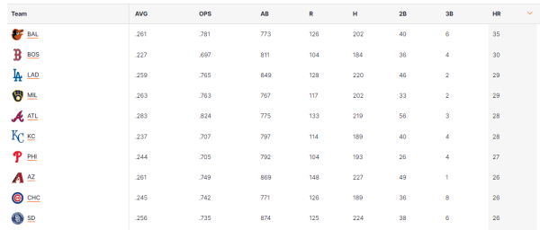 MLB 2024년 시즌 팀 홈런 TOp10 입니다